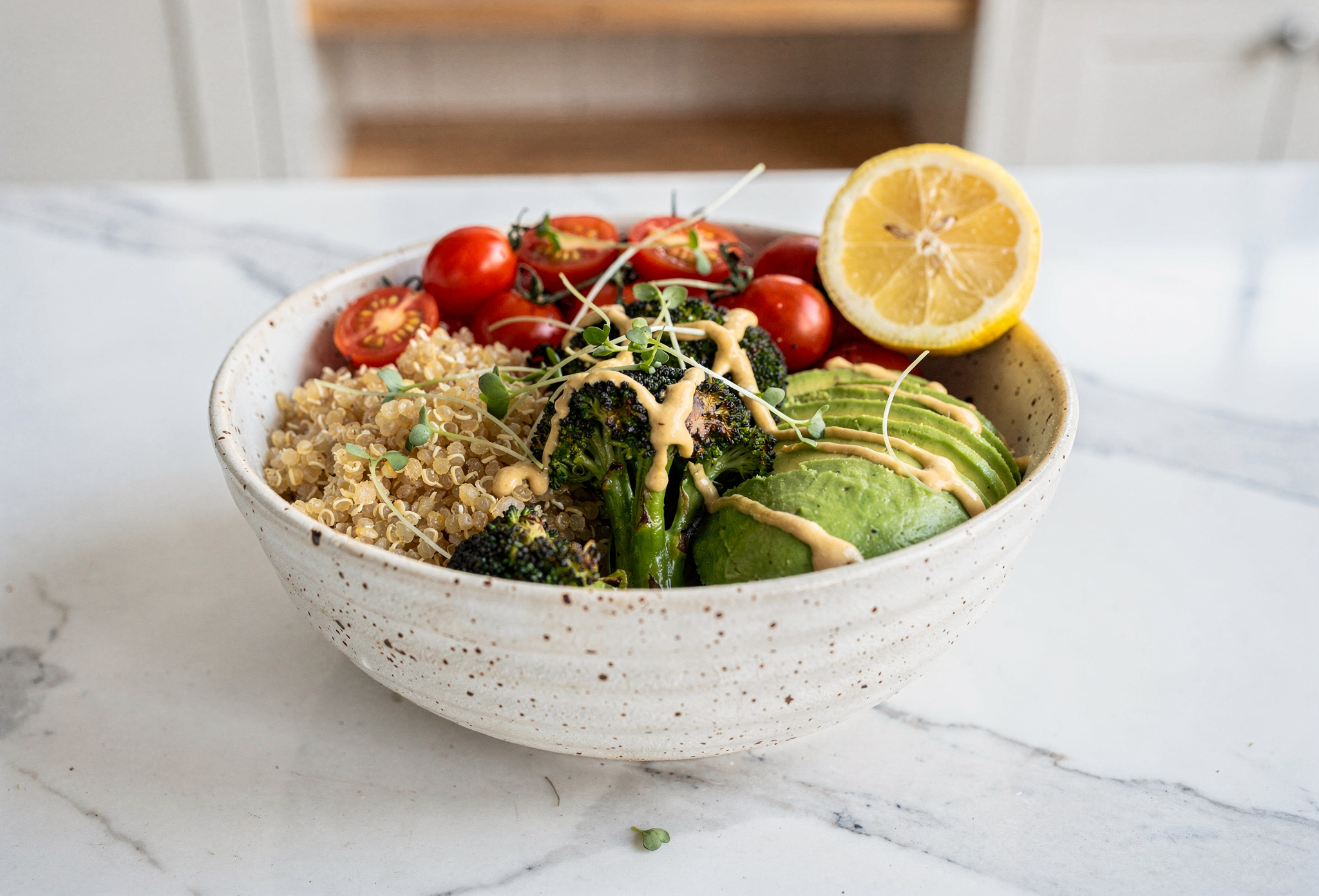 Taze sebzeli ve avokadolu renkli makro dengeli tahıl kasesi